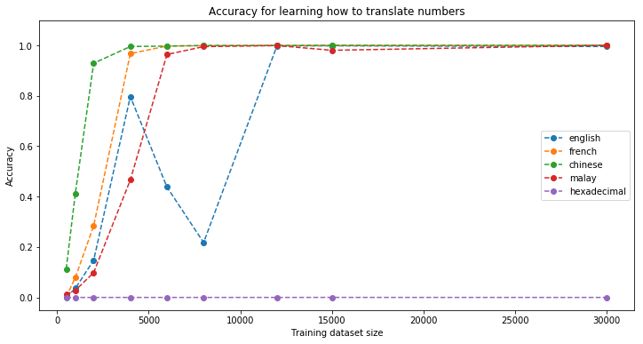 This blog post illustrates how difficult it is for a simple seq2seq model to learn how to translate numbers from different languages (e.g. French, English, Chinese, Malay) to their digits (base 10) representation. It is based on the very good deep learning tutorials by Olivier Grisel and Charles Ollion. Note that this is a very simple seq2seq model, cf. fairseq or sockeye for more sophisticated ones.