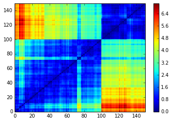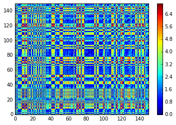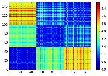 The dataset contains 150 points in R^4 (150 flowers described by 4 features). Using pdist we can compute a 150 x 150 distance matrix which is displayed below.