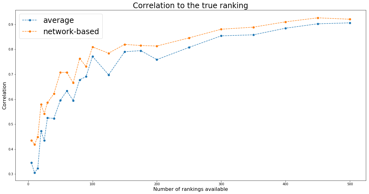 In the previous blog post titled Combination of Rankings, we introduced a method to combine several rankings, each one weighted by some confidence, into a final one having greater predictive power (higher correlation with the true outcome, i.e. observed ranking). We explained there the motivation for using a network-based approach instead of the baseline average: dealing with widely heterogeneous coverage, missing data, and biases in the missing data. The network-based approach is supposed to outperform significantly the naive avearge one when there is a strong bias in the missing data. For example, the latent best ranks have usually data which are lacking for the latent lowest ranks. In that case, the worst of the best ranks in this partial ranking will end up having the lowest ranks possible, which produce a very negative contribution in the final average ranking. The network-based approach does not suffer from this problem.