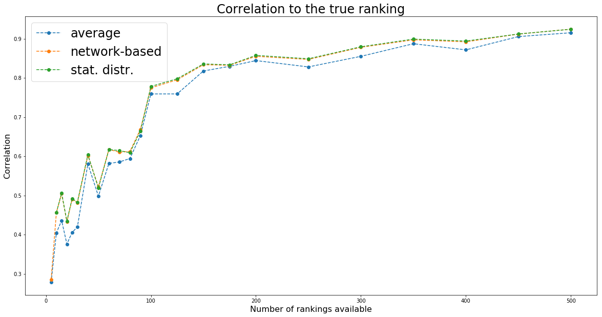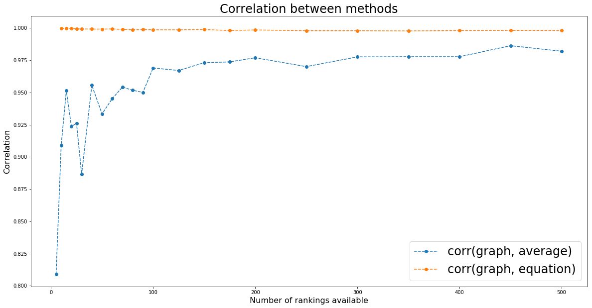the naive random walking and solving the linear equation give very close solution (correl ~= 0.99+); Since we use a fixed number of steps for the random walking, it should approximate less well for bigger graphs (more rankings to combine): We indeed notice that correlation between the two methods decrease slightly.