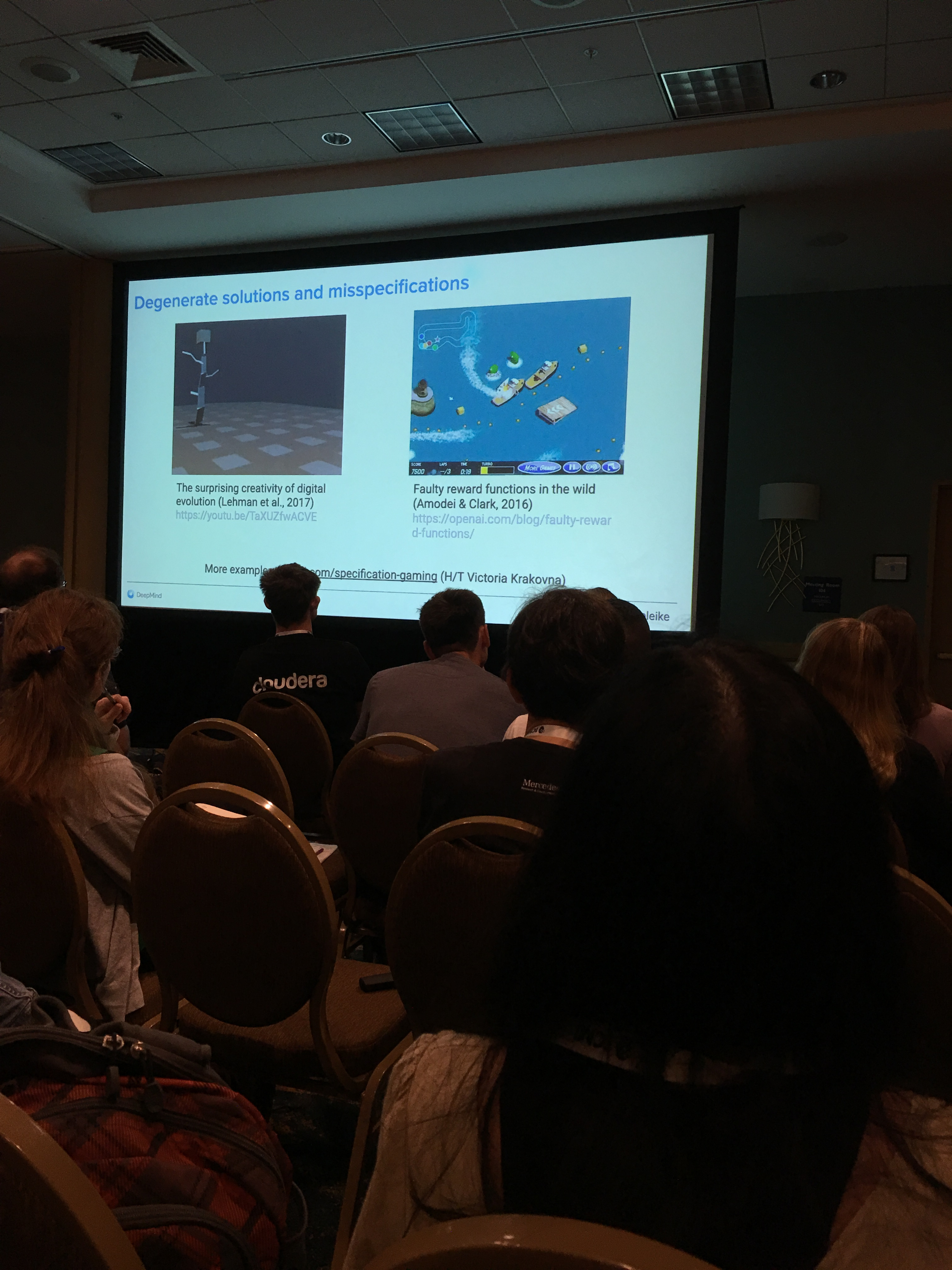 - Not many takeaways for me on this one, but that Reinforcement Learning is tricky, buggy, and that researchers at DeepMind are working hard to avoid the so called ‘surprising creativity of digital solution’ which are faulty behaviours that exploit a faulty misspecified reward function. These things are easy to spot on (computer) games, but for more abstract applications, good luck! The discussion went on different ways to prevent such behaviors: putting a human in the loop, restraining the action space (blocking some obviously bad actions), some potential theoretical verification of neural networks against adversarial attacks (you add some invisible noise to an image, or change a single pixel, and the classifier is totally fooled) by checking properties of stability around the boundaries (but doesn’t scale well as requiring the solution of some NP-complete problem, SAT). Nonetheless, for a precise (specific) definition of robustness, some small 6-layer perceptron (~13,000 parameters) was verified robust to adversarial attacks. Also, biases of data/models were mentioned: the COMPAS software which is a decision support tool to identify the likelihood of a defendant becoming a recidivist has been shown to be biased against black people. Hence, the trendy research question of how to properly define ‘fairness’. In the academic literature, dozens of different definitions co-exist which are not consistent between themselves. Ongoing research… In conclusion, this tutorial provided (at least to me) quite a gloomy picture of machine learning capabilities (in the wild) with respect to taking important decisions for people’s lives (from loan to education and justice).