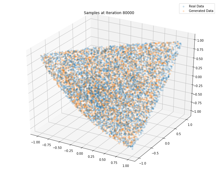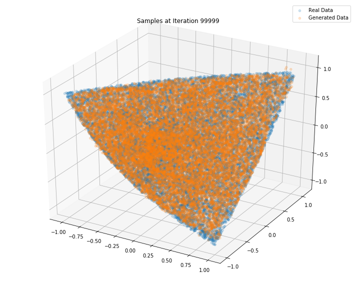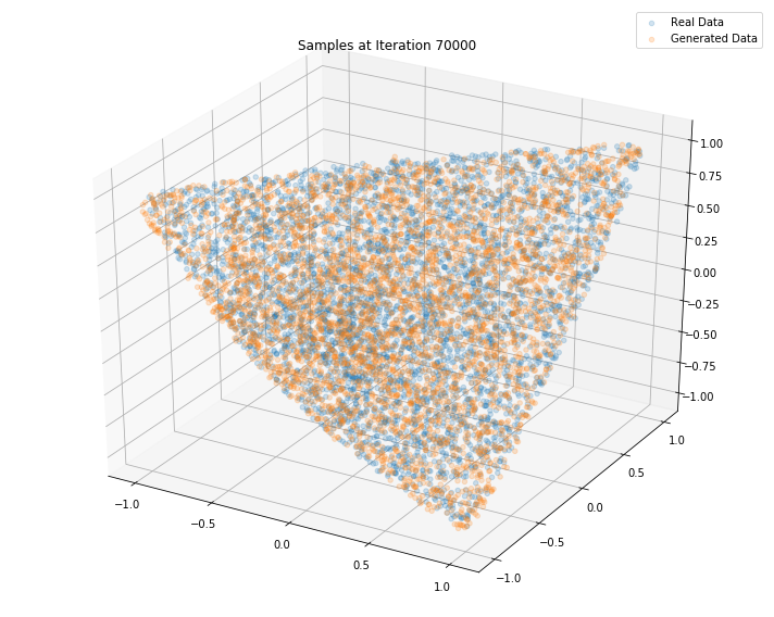 Below some code that allows to sample nearly correctly from the 3D elliptope. Notice that a few points are living outside the hull. They correspond to 3x3 matrices which are not positive semidefinite (hence not proper correlation matrices). Notice that, here, we generate only 3 coefficients since out of the 3x3=9 coefficient, only n(n-1)/2 = 3 matters (3 being forced to 1 (diagonal), 3 are defined by the symmetry). We could ask the GAN to learn the diagonal property (=1) and the symmetry property (C = C^T), but that would make the problem uselessly harder.