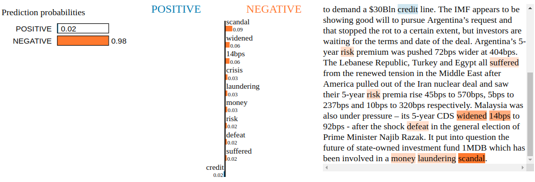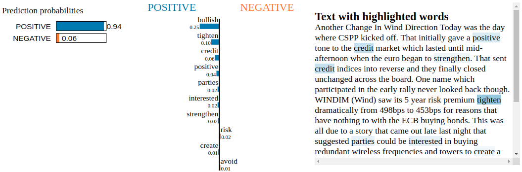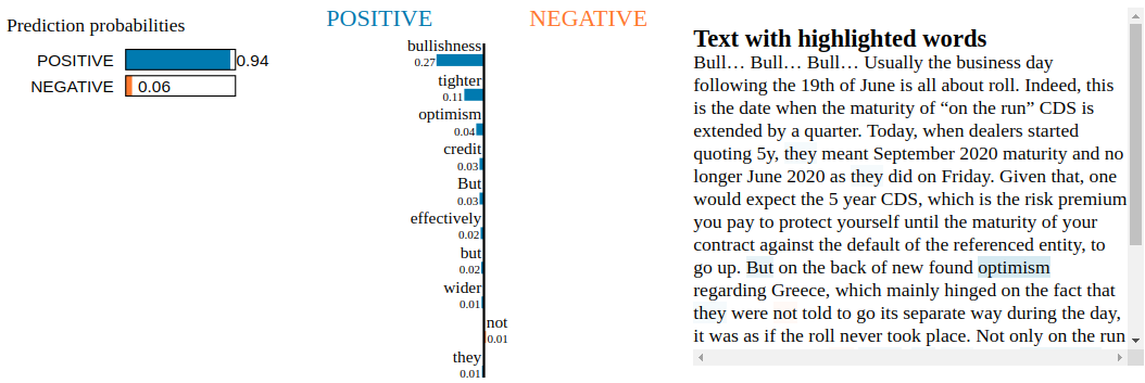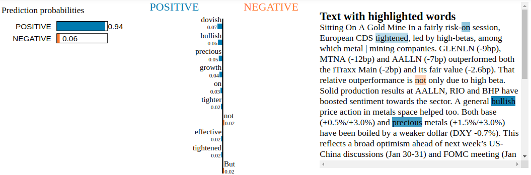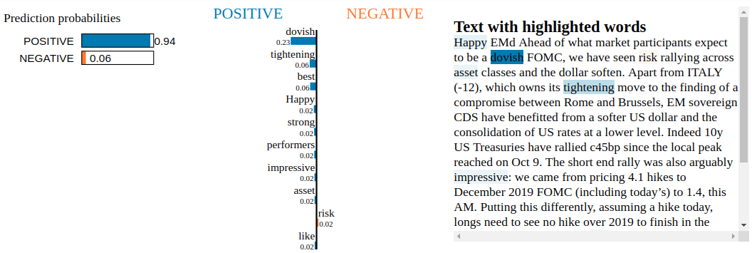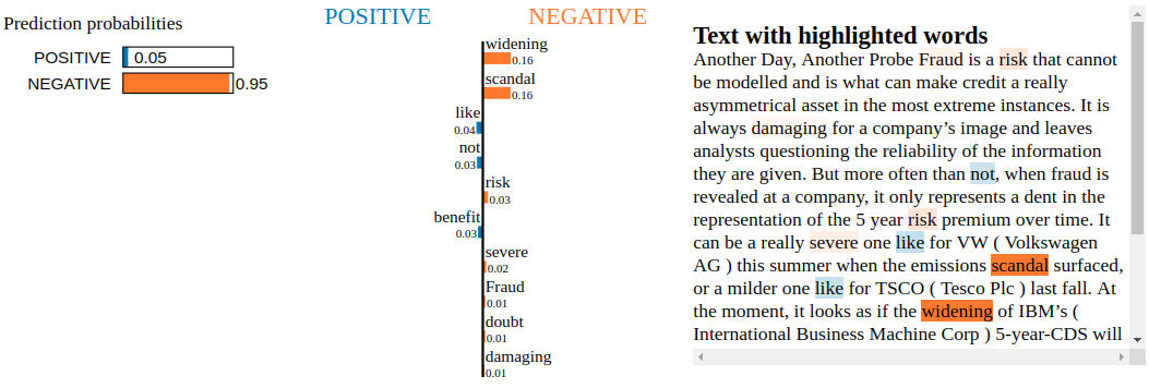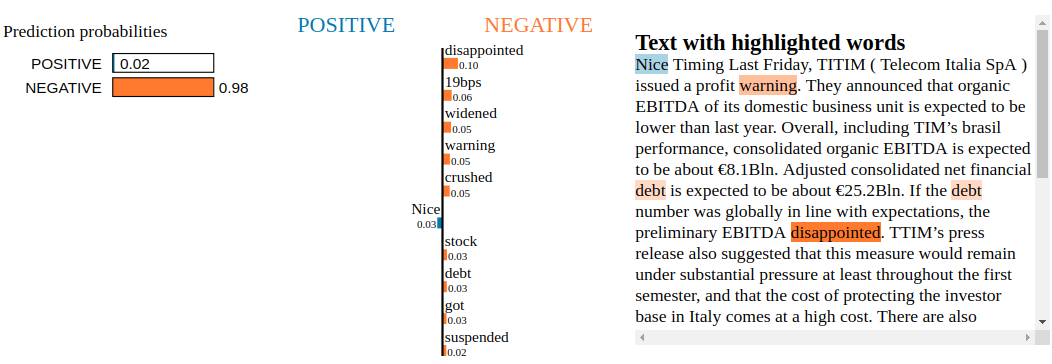 Conclusion: By inspecting the Snorkel Labeler with LIME, we are not able to find blatant clues of overfitting to irrelevant tokens. Not unexpected as the Snorkel Labeler sees only the text through the heuristics defined in the labeling functions (here, the financial jargon and common vocabulary encoded in VADER). It would be interesting to see how it goes when LIME is applied to a fine-tuned pre-trained end-to-end model such as BERT or XLNET.