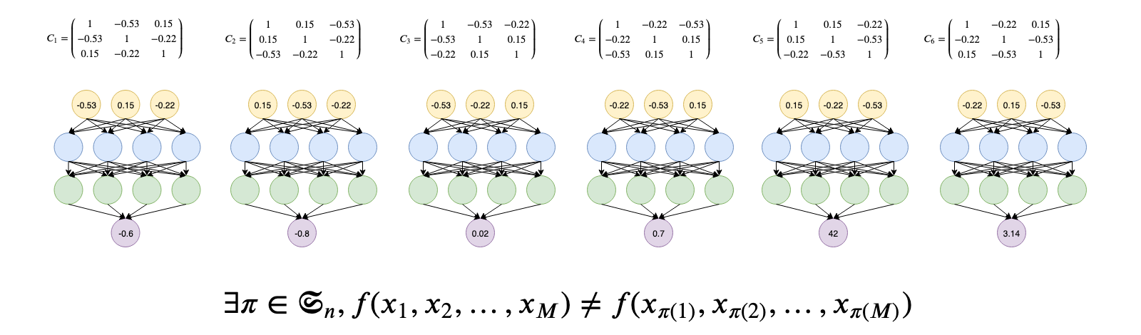 Standard neural networks are not permutation invariant. That is changing the order of their inputs may yield to different outputs as illustrated above. For some tasks, this is an unwanted behaviour.