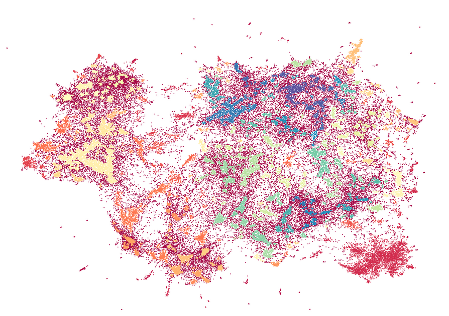 Step 3. Find dense clusters (e.g. using a clustering algorithm such as HDBSCAN); a cluster is a topic
