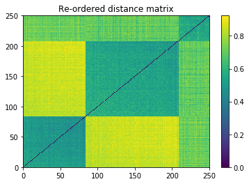 plt.title('Re-ordered distance matrix')