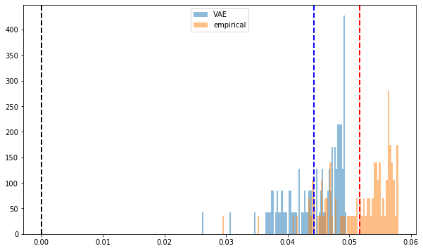 However, the tutorial assumes that each pixel follows a Bernoulli distribution whereas correlation matrix coefficients live in [-1, 1]. Applying very naively the tutorial gives the following results. They are not too bad as S&P 500 stocks empirical correlations are mostly positive (cf. these stylized facts), and symmetrically centered around a mean of 0.4 approximately. It happens that the for this distribution the loss “reconstruction loss + Kullback–Leibler loss” is well balanced, and behaves nicely.